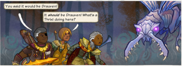 The party encounter a Thrixl who communicates telepathically with one of the heroes.