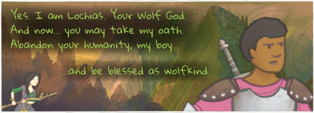 The party encounters a hill with a summit shaped like a wolf's head. At the summit one of the party is addressed by the Wolf God, who invites them to abandon their humanity... and be blessed as wolfkind